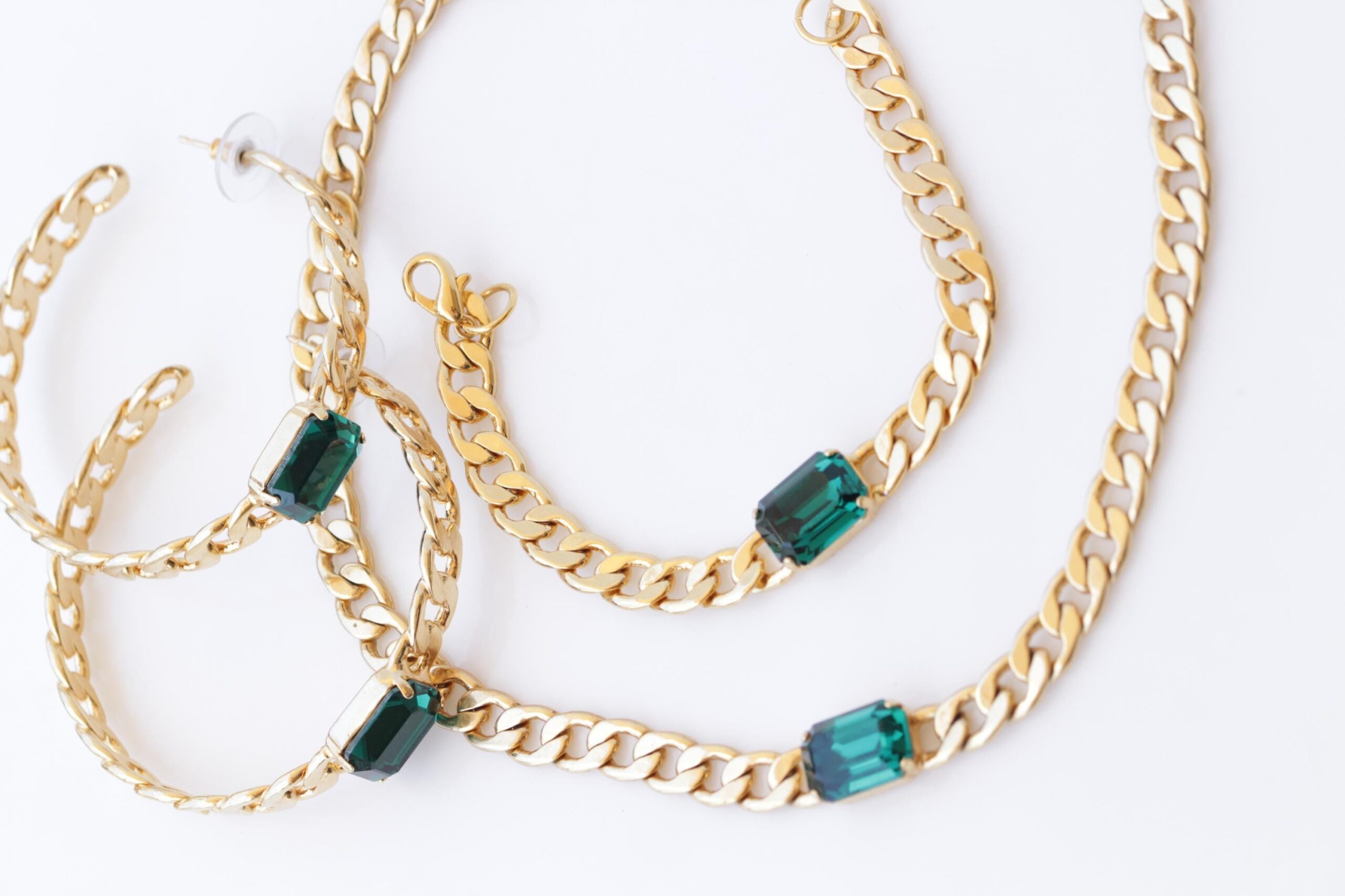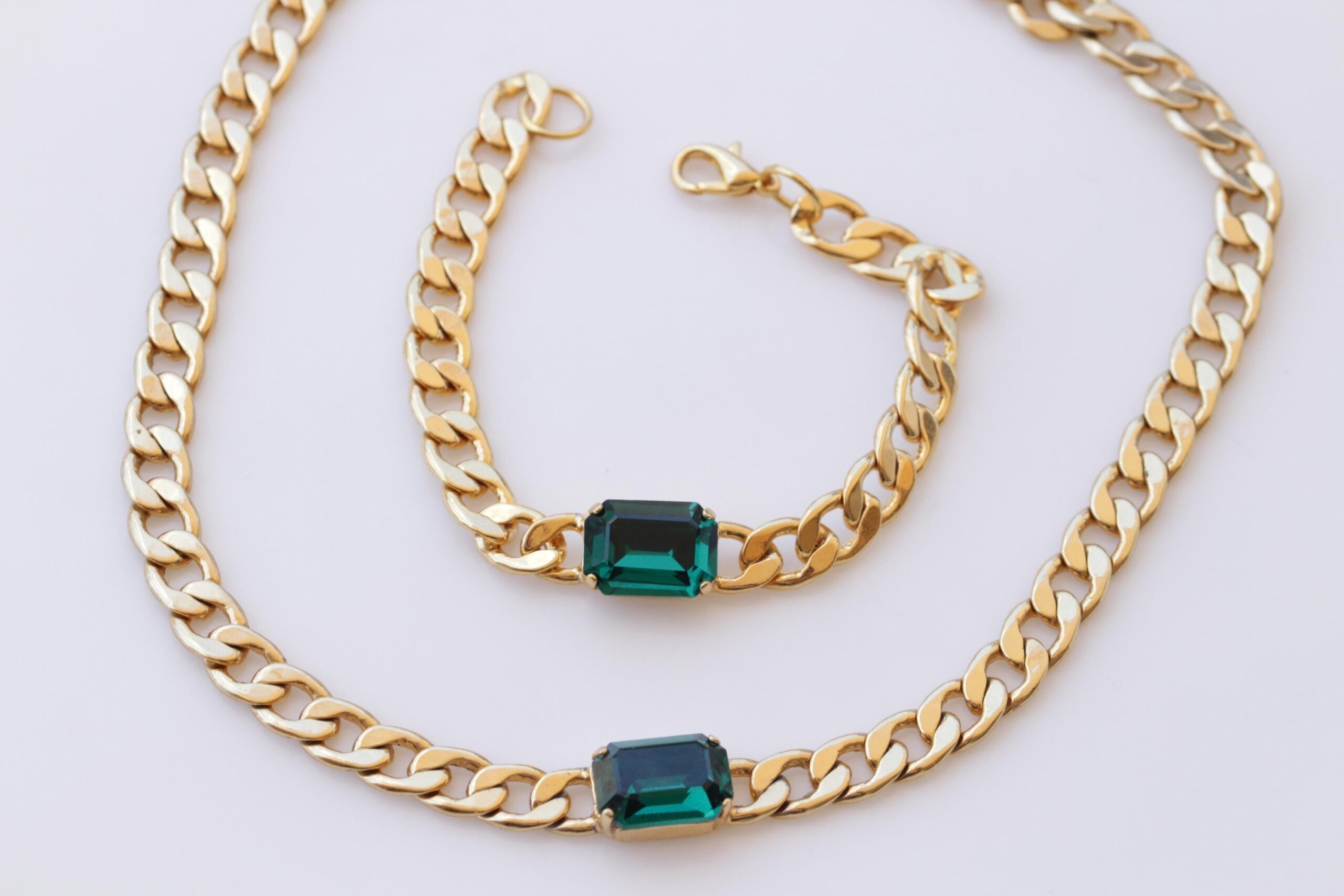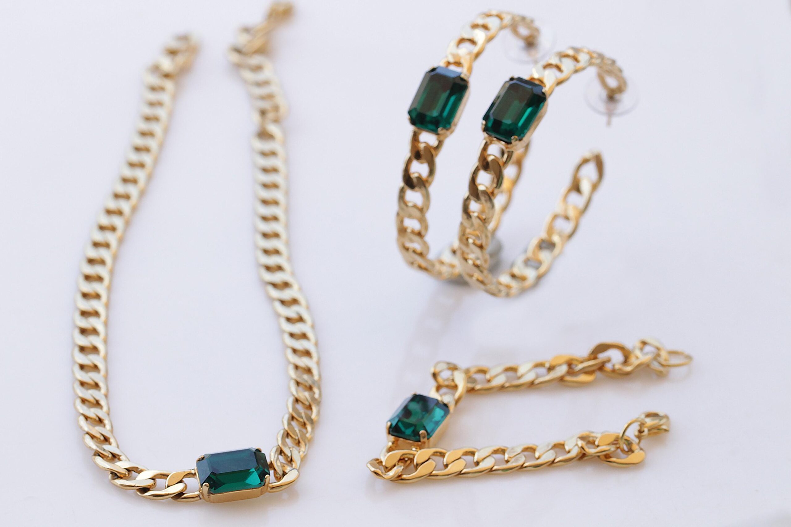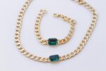 hoop earrEMERALD CENTER STONE Gold Chain,Cocker Wedding Dark Green Necklace,Chunky Emerald Bracelet Necklace Earrings Set, Brides Emerald Jewelry Set