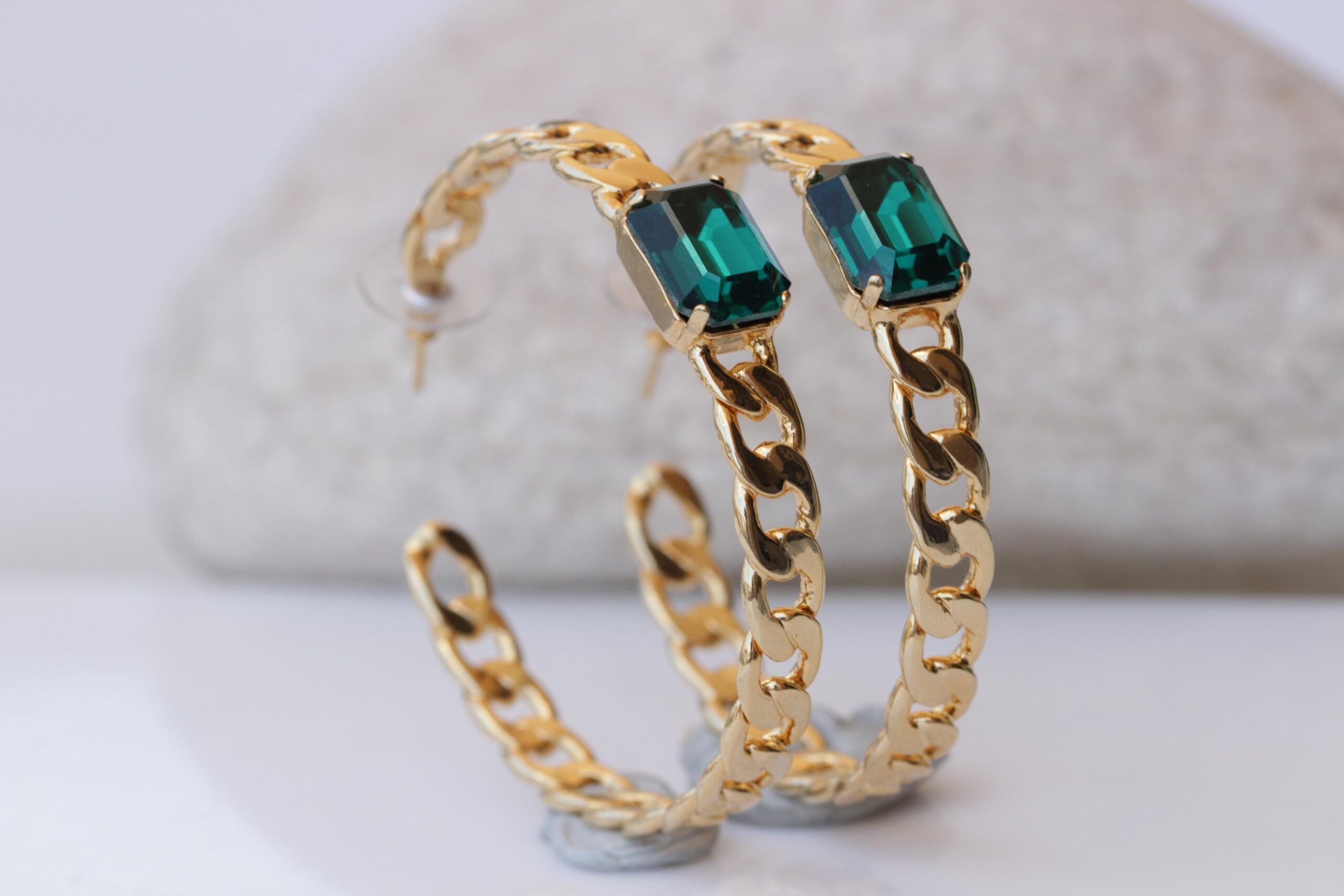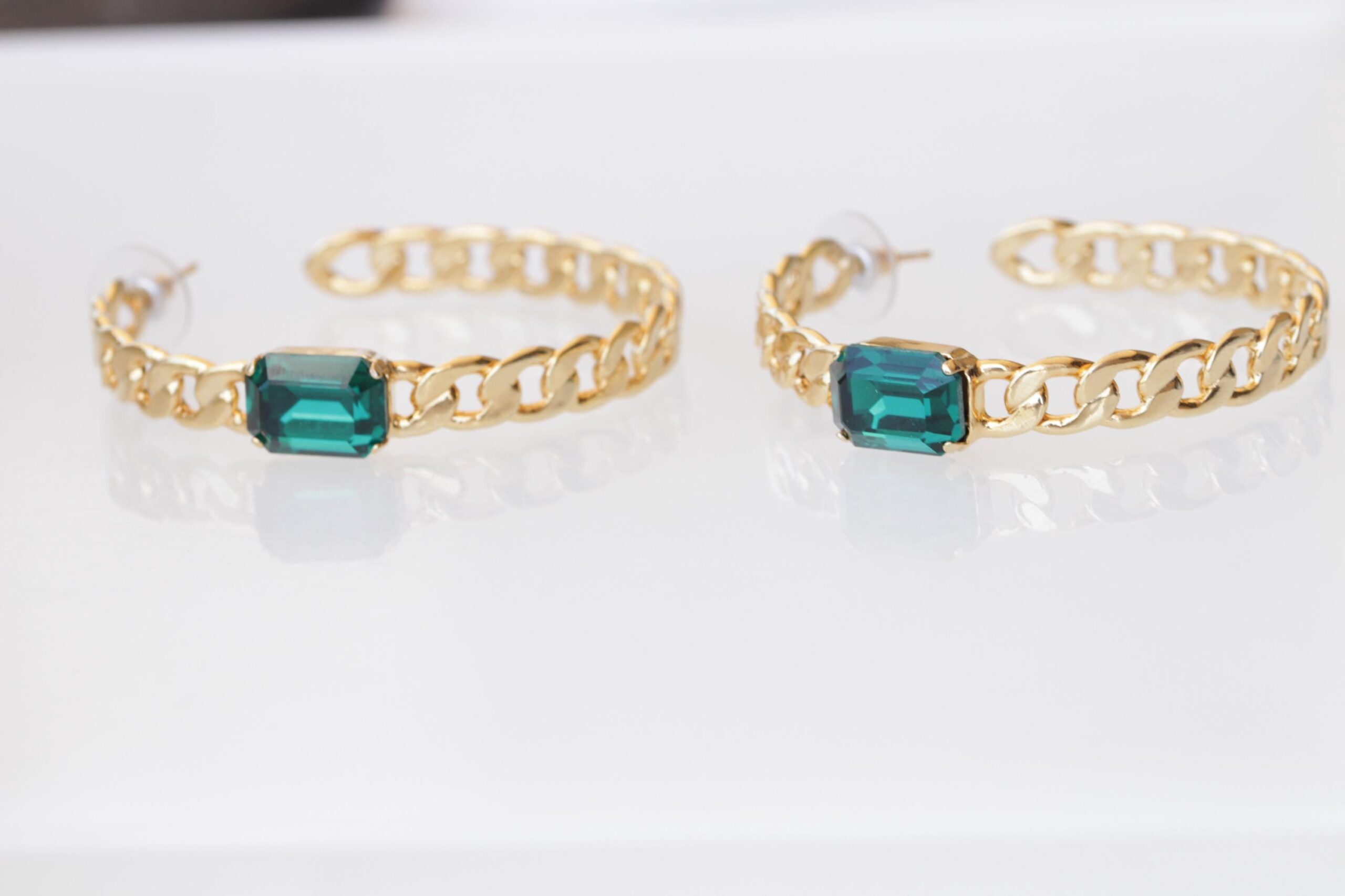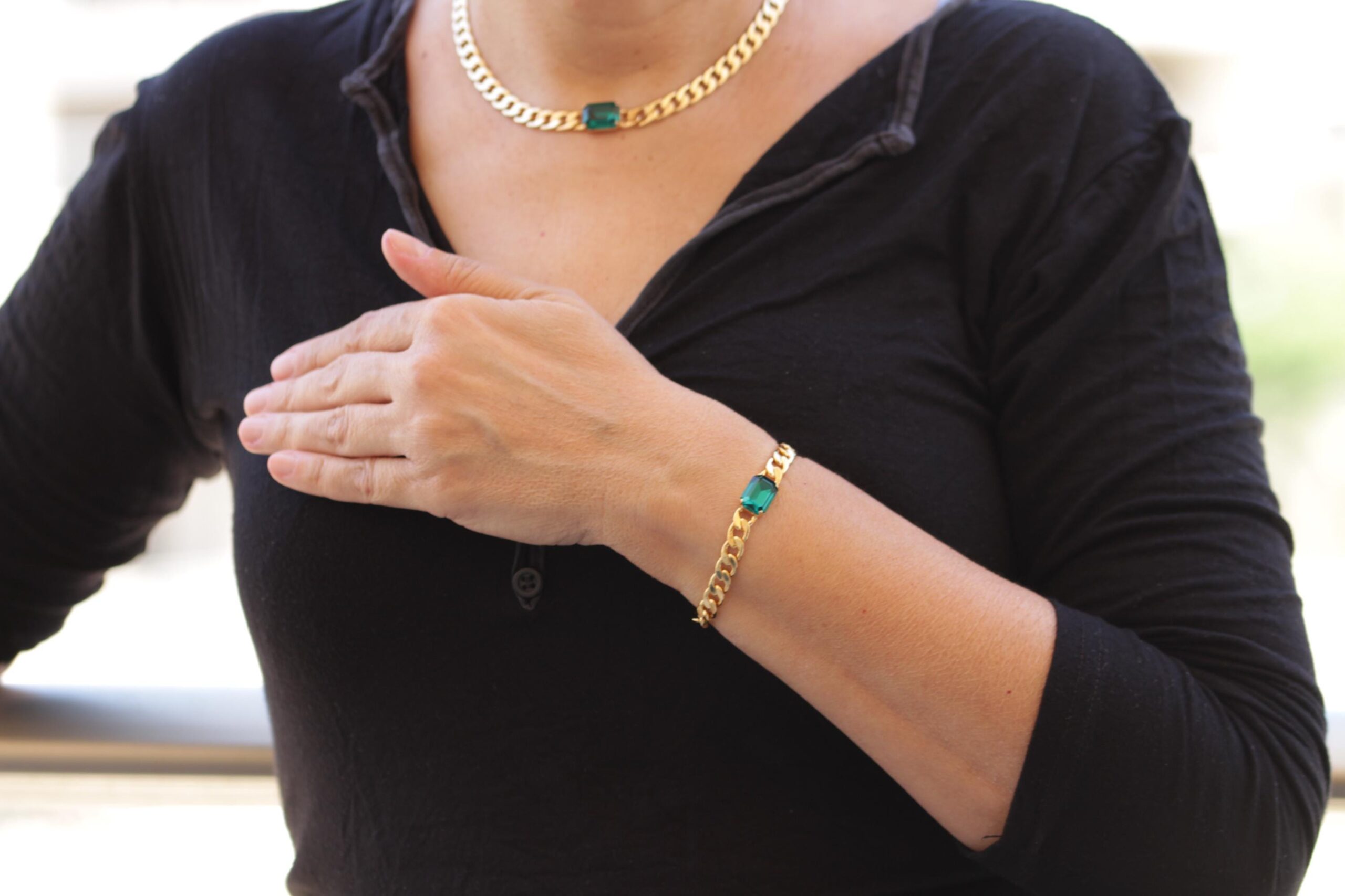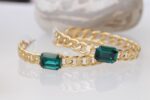 hoop earrEMERALD CENTER STONE Gold Chain,Cocker Wedding Dark Green Necklace,Chunky Emerald Bracelet Necklace Earrings Set, Brides Emerald Jewelry Set