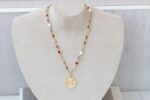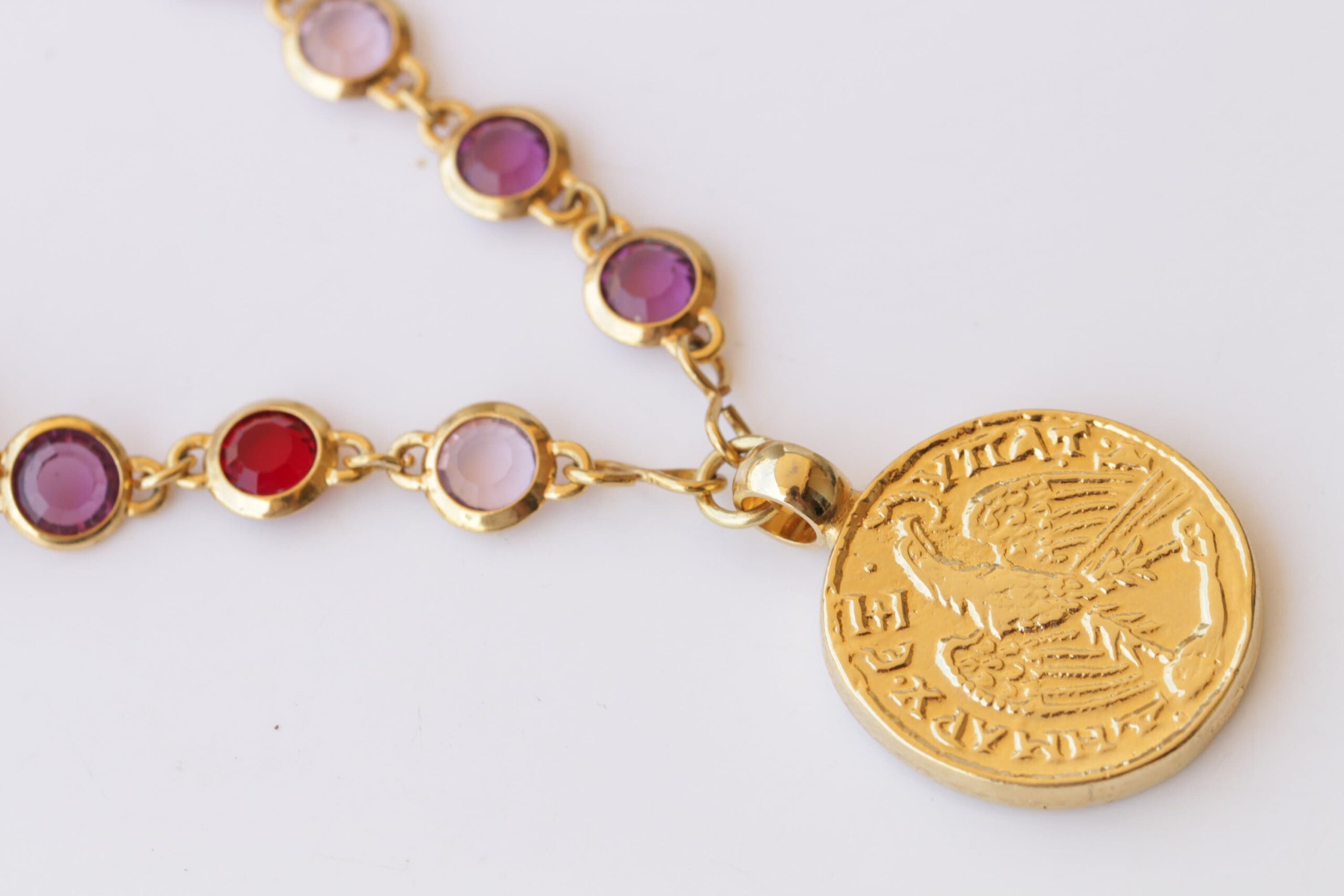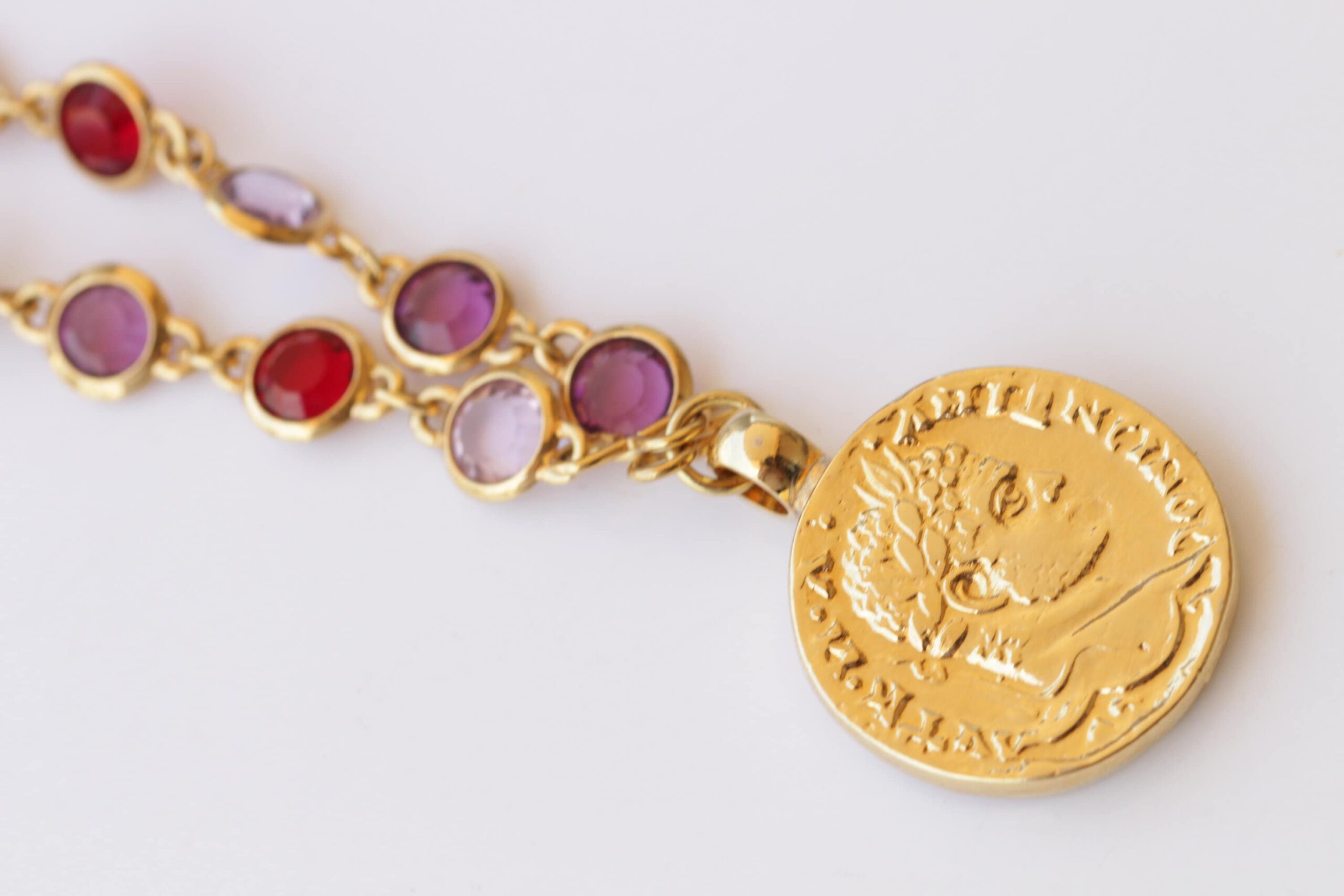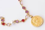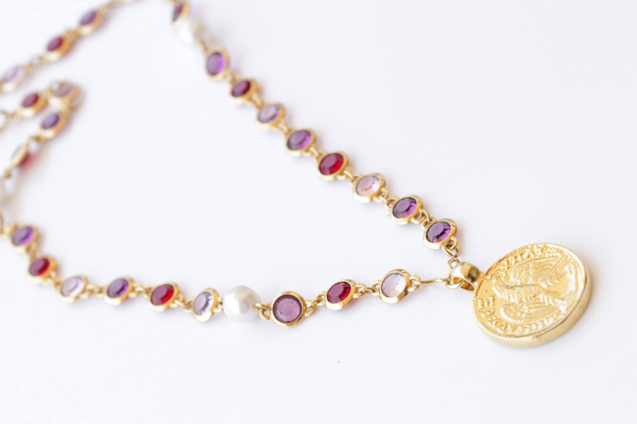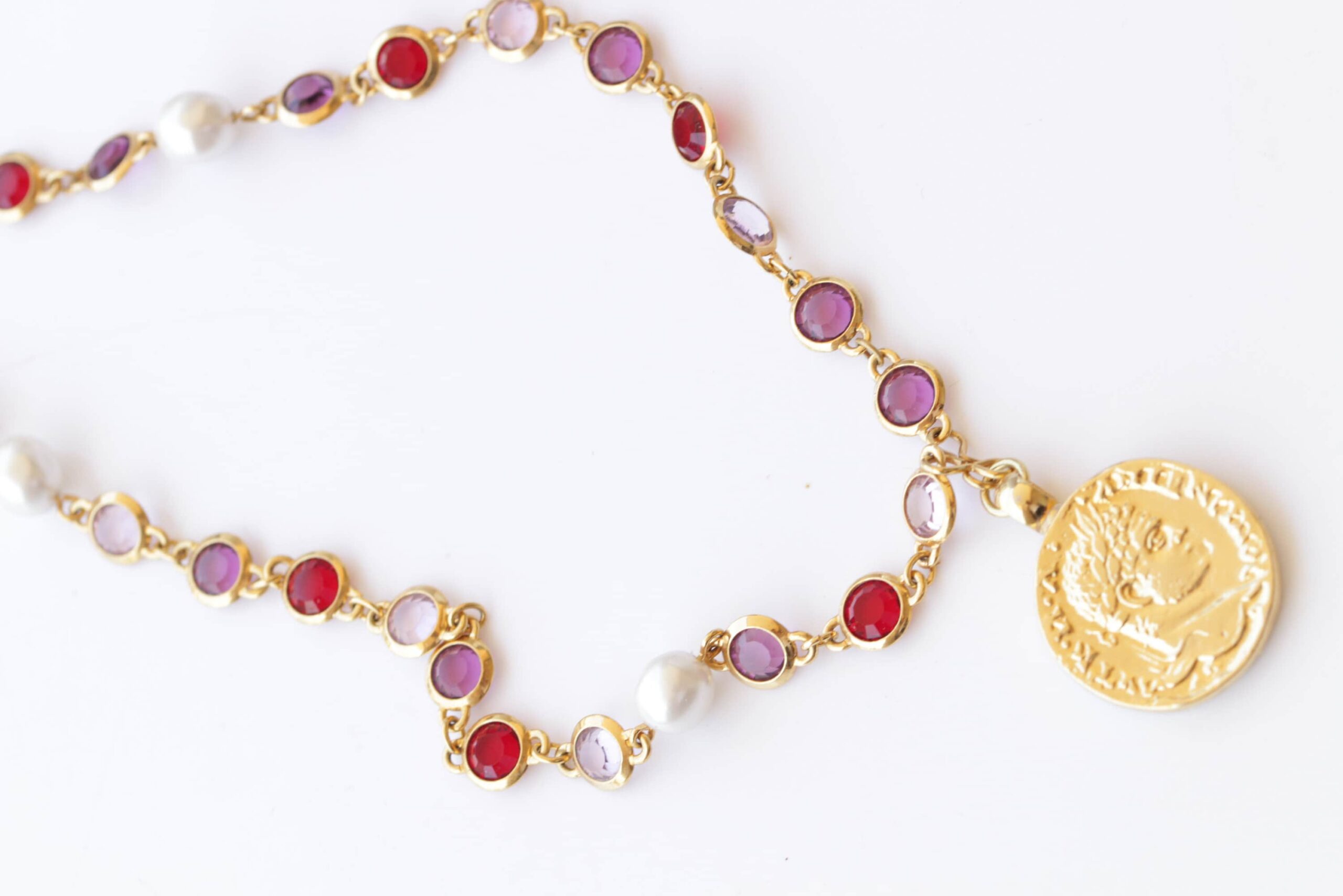 COIN NECKLACE, Woman Necklace, Colorful Red Purple Pink And Pearls Necklace, Gold Coin Pendant, Statement Multicolor Necklace, Medallion